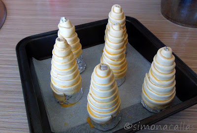 Dacă nu avem forme speciale pentru conuri, putem improviza unele, din carton sau conuri de îngheţată îmbrăcate în folie de aluminiu. Conurile se aşează apoi în tava de aragaz tapetată cu hârtie de copt, se ung cu ou bătut şi se coc timp de circa 20 minute, la 190 grade Celsius (până când se rumenesc frumos).
